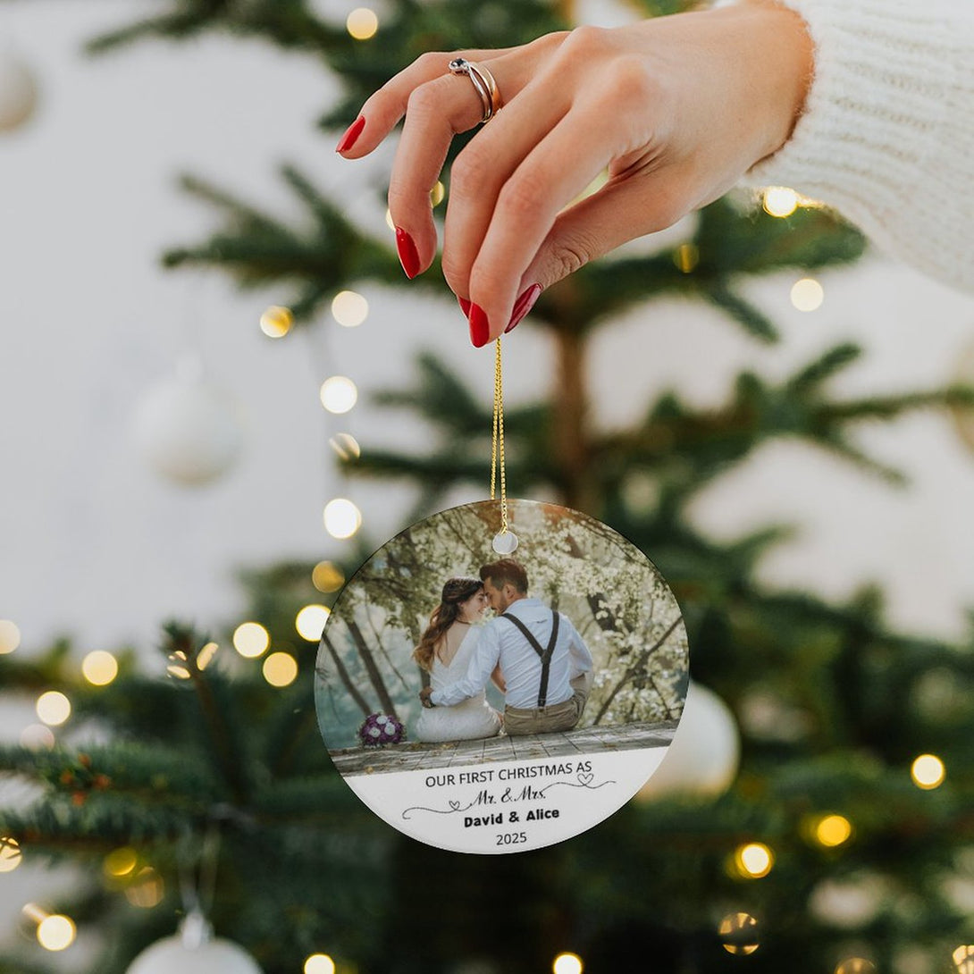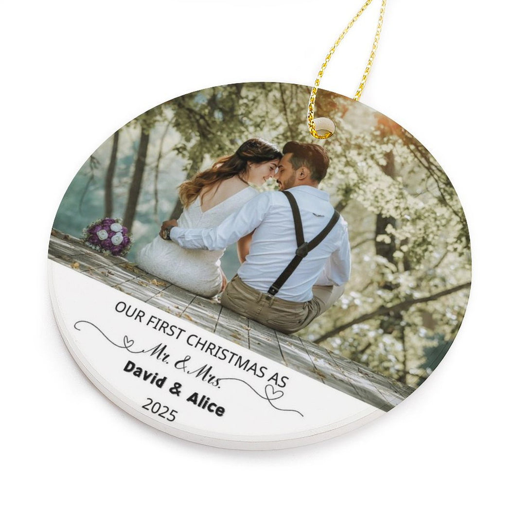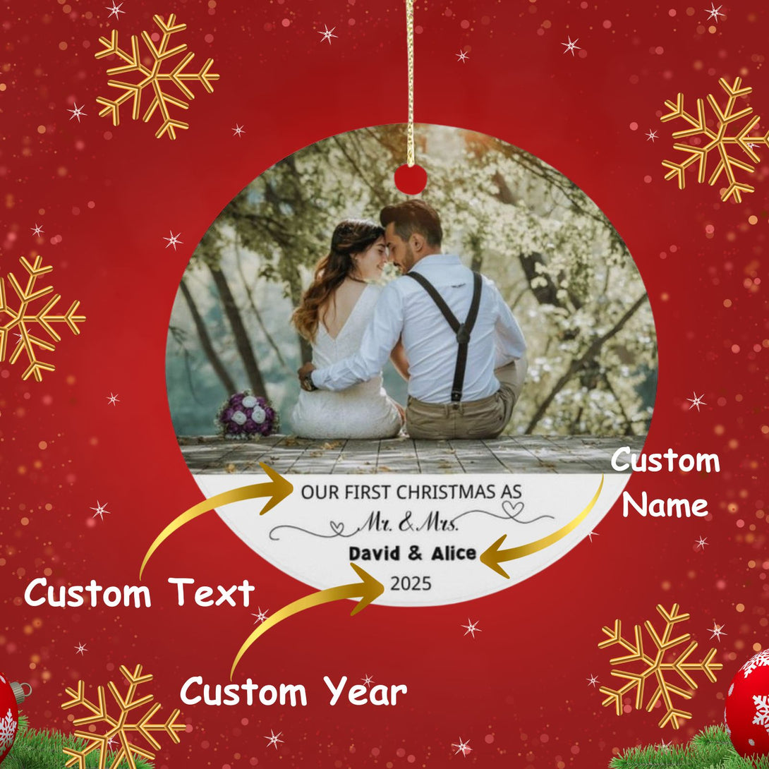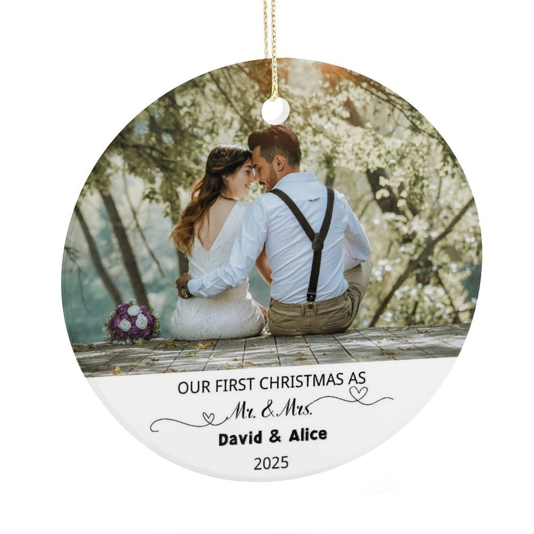 Elegantly arched below the image are the heartfelt words, "Our first Christmas as Mr. & Mrs." The celebration is completed with the couple's names and the memorable year inscribed beneath, forever marking this special milestone.