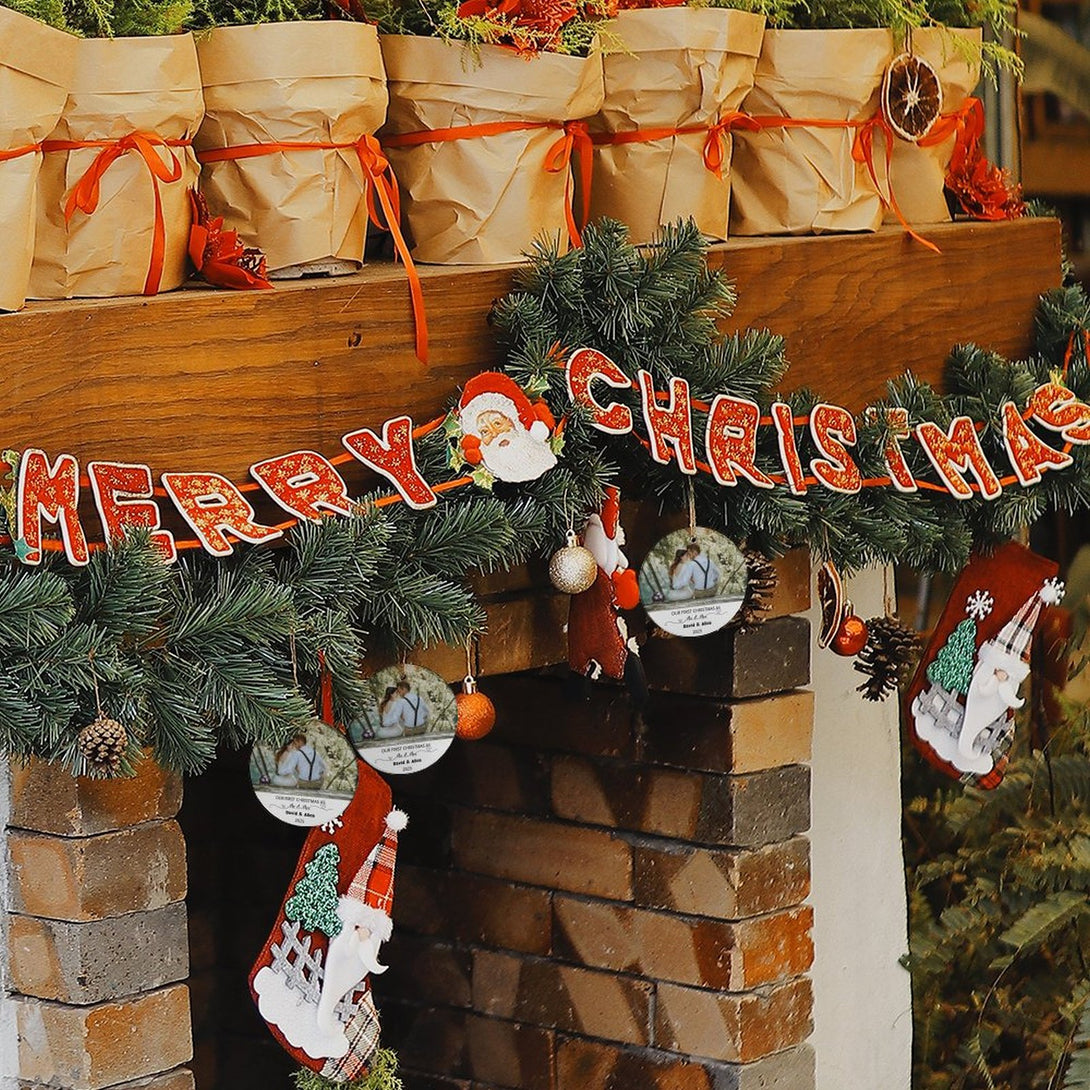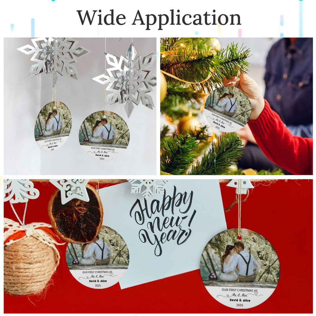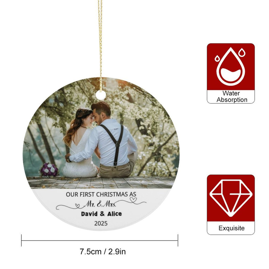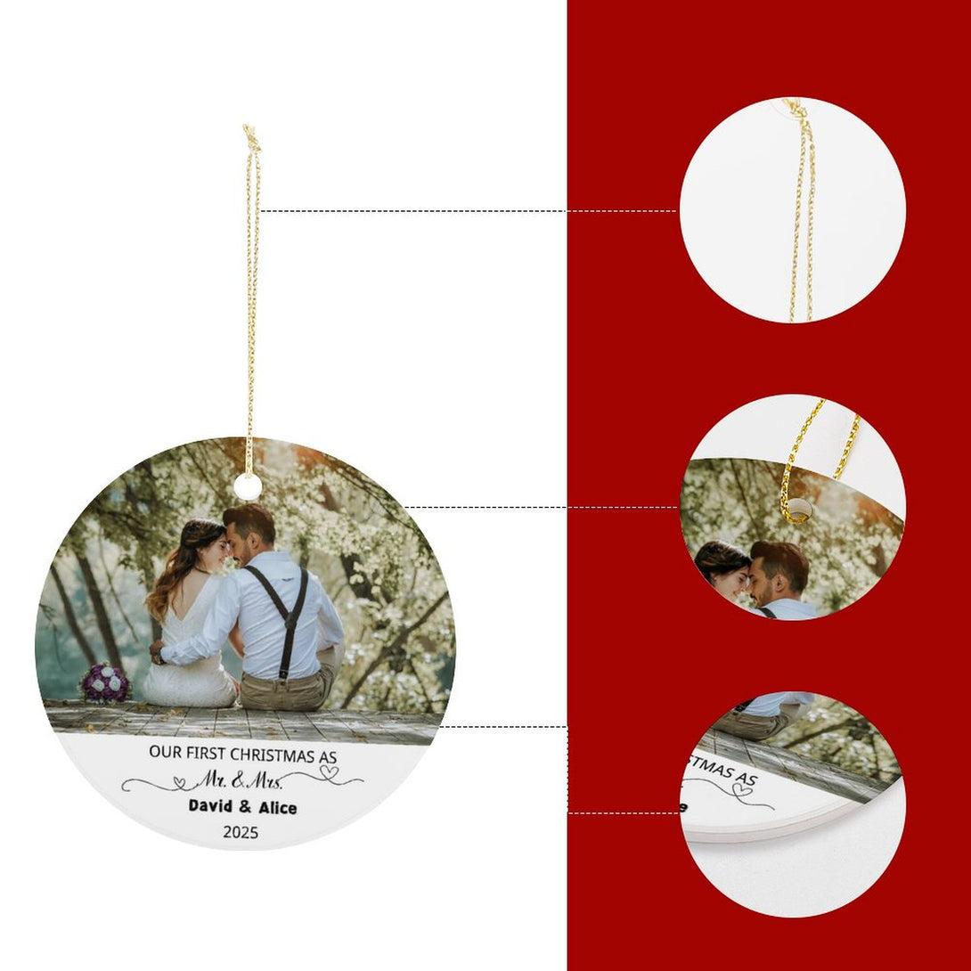 This exquisite, handcrafted ceramic Christmas ornament captures the joy of a new beginning. The circular, glossy bauble features a beautifully printed, custom photo of a smiling couple, making it a truly personal keepsake.